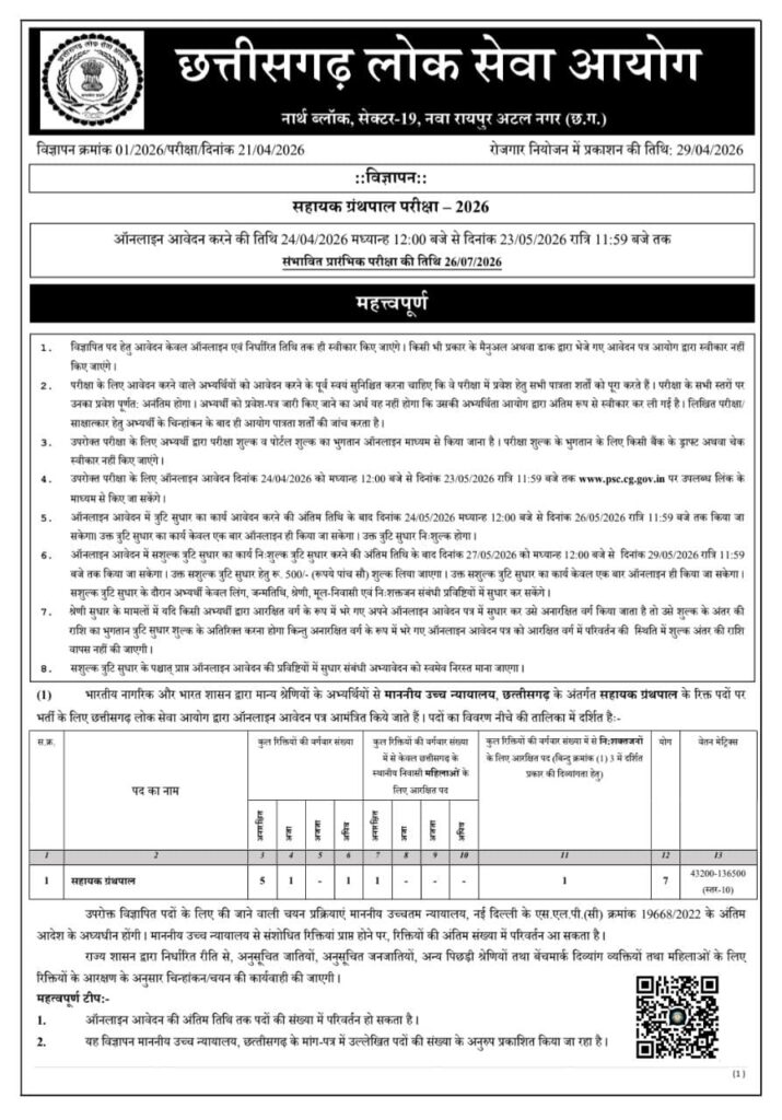 The CGPSC Assistant Librarian Recruitment 2026 notification has been officially released by the Chhattisgarh Public Service Commission (CGPSC). This recruitment drive is being conducted for Assistant Librarian posts under the Higher Education Department. Candidates who are looking for government librarian jobs in Chhattisgarh can apply online through the official website.