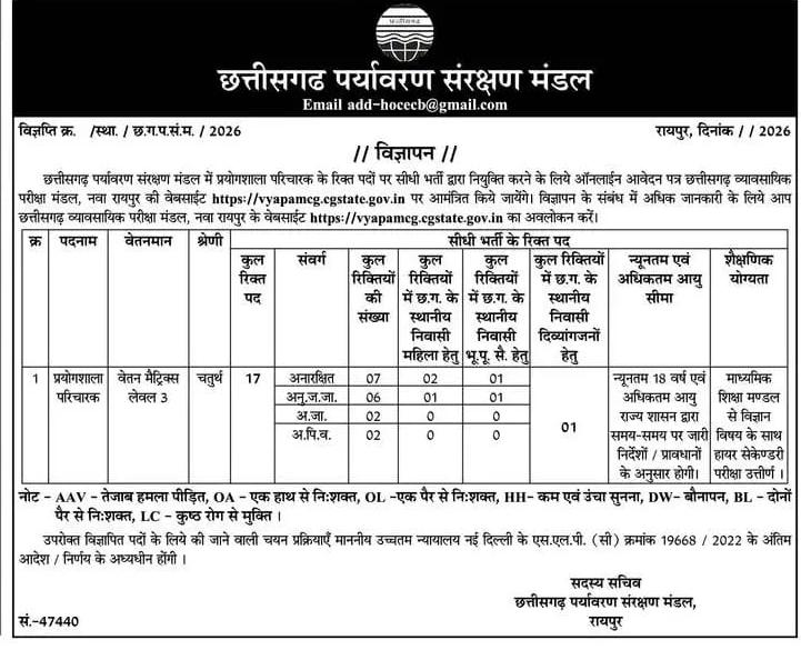 Chhattisgarh Laboratory Attendant Recruitment 2026: In a significant opportunity for job seekers in Chhattisgarh, the Chhattisgarh Environment Protection Board (CEPB) has released an official notification for the direct recruitment of Laboratory Attendant (เคชเฅเคฐเคฏเฅ‹เค—เคถเคพเคฒเคพ เคชเคฐเคฟเคšเคพเคฐเค•) posts. The recruitment aims to fill multiple vacancies through a transparent selection process, offering candidates a stable government job in the environmental sector.