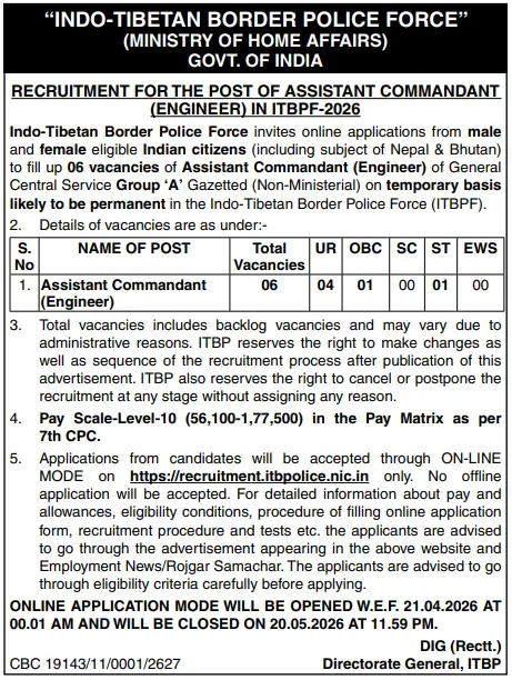 Apply online for ITBP Recruitment 2026 for Assistant Commandant (Engineer) posts. Check vacancy, salary, eligibility, last date, selection process & apply link.