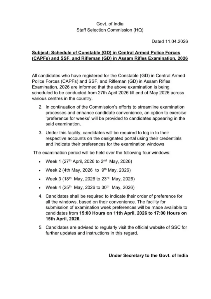 As per the latest official notice dated 11.04.2026, the SSC GD 2026 exam date is scheduled from 27th April 2026 to the end of May 2026.